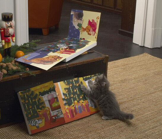 Die zweite Szene soll einen Adventskalender für Katzen und Hunde ins rechte Licht rücken. Der kleine blue-tabby Maine Coon Kater kennt keine Hunde, also wird getrennt fotografiert in der selben Kulisse. Später werden die Bilder zusammengesetzt, eine kniffelige Arbeit, die viel Geschick und Erfahrung mit der Bildbearbeitung voraussetzt. Bei den Aufnahmen mit dem Kitten muss Frank Aschermann immer schon im Kopf haben, wie der Hund dazu platziert werden kann. Dem kleinen Kater machen die Aufnahmen sichtlich Spaß. Begeistert patscht er immer wieder auf den Kalender. Die Tiertrainerin animiert ihn dazu mit einer großen Fasanenfeder. Es muss genau auf die Stimmung der Tiere eingegangen werden. Sind sie zu munter laufen sie aus der Szene und wollen die Umgebung erkunden, sind sie zu schläfrig, kann man sie nur schlecht animieren. Das Timing ist perfekt, die Bilder rasch „im Kasten“.